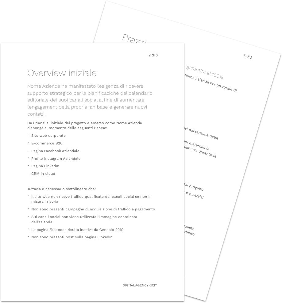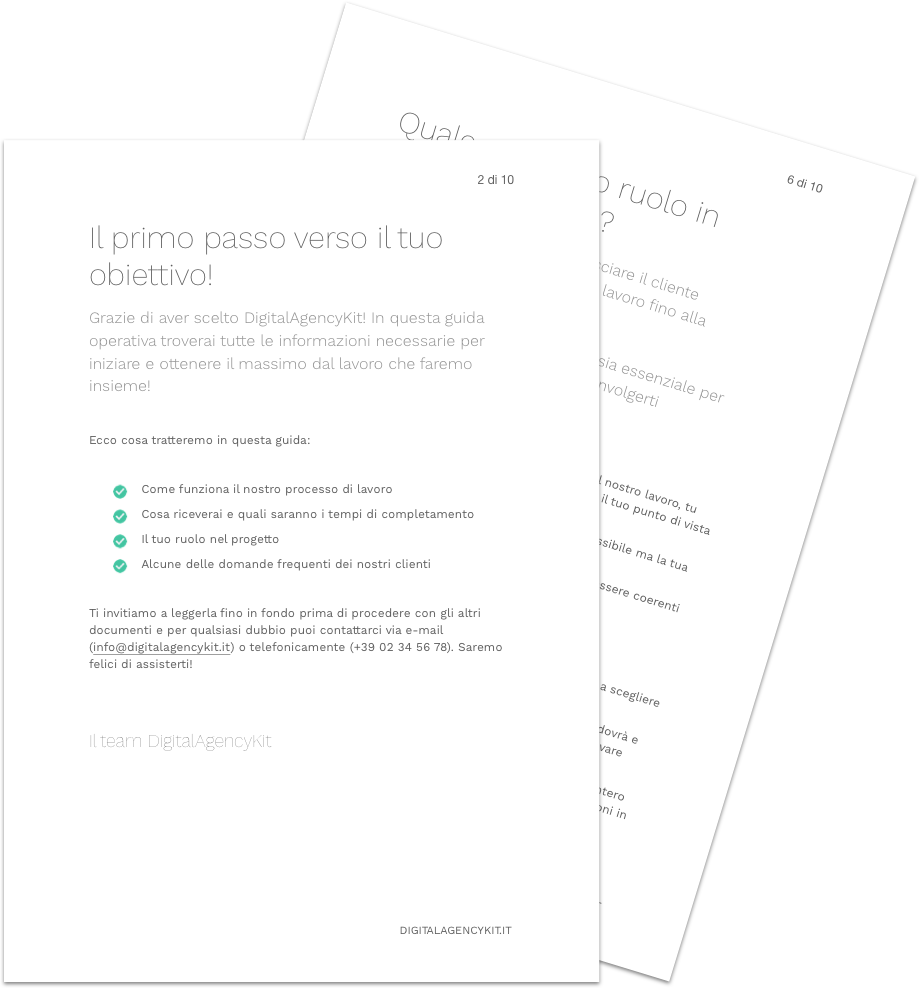 Abbiamo messo nel Digital Agency Kit tutti i materiali che possono servire a te e alla tua agenzia per agevolare e facilitare la relazione con i clienti fin dal primo momento.